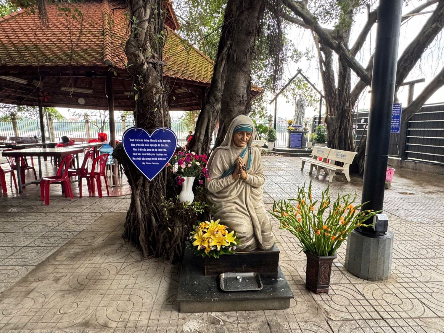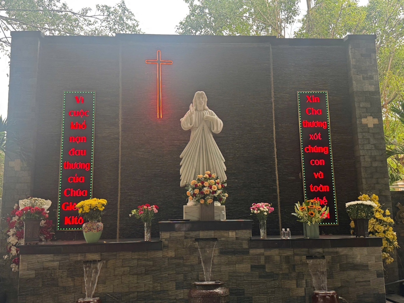 Quả thật nơi đây là không gian cầu nguyện ấm cúng và linh thiêng, không chỉ có Đài Đức Mẹ, nhưng còn có Lòng Chúa Thương Xót, Thánh Giá mà Chúa Giêsu giơ tay ra tha thứ cho tội nhân, có Tượng Thánh Giuse, Thánh Têrêsa Calcutta…