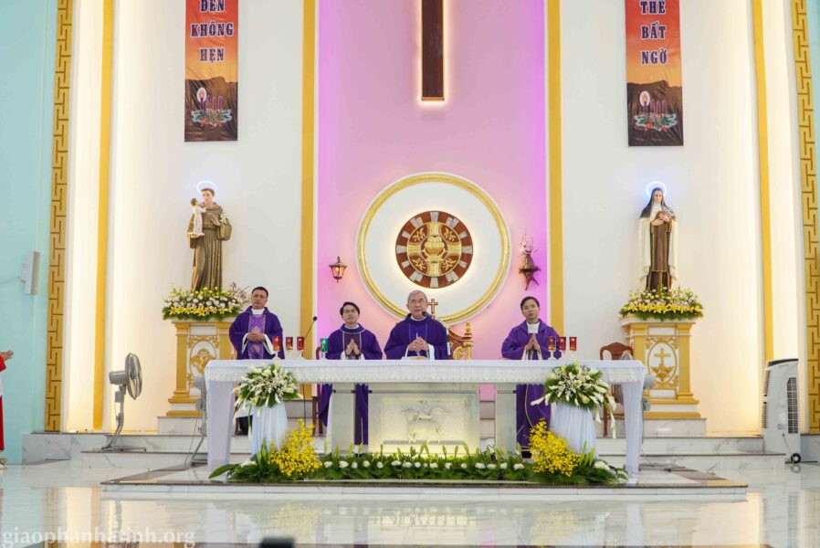 Hiệp dâng thánh lễ còn có sự hiện diện của cha quản xứ, cha Phaolo Nguyễn Văn Đức, cha Giuse Trần Hữu Tầng, quý tu sĩ và rất đông cộng đoàn phụng vụ.