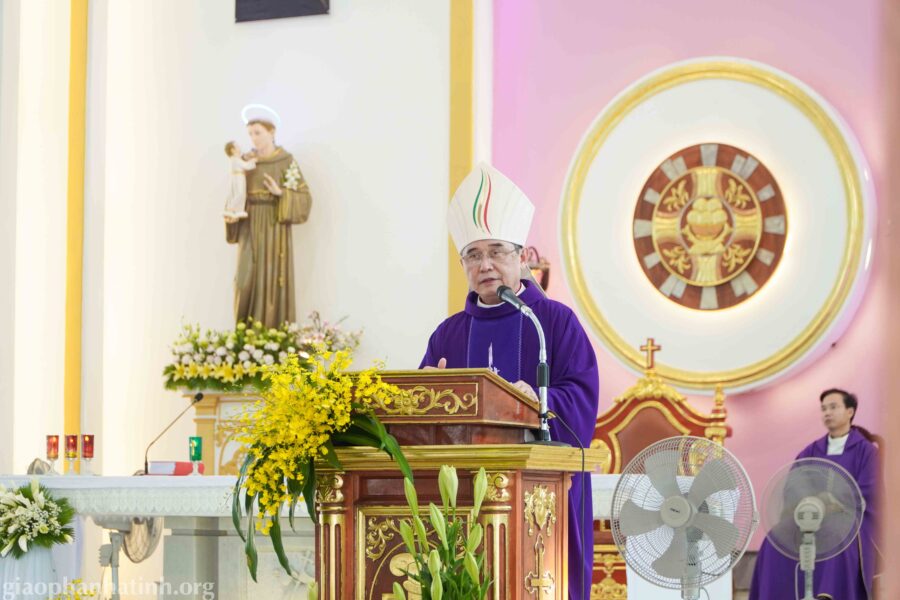 Chia sẻ trong thánh lễ, khởi đi từ bài Tin Mừng theo Thánh Maccô và các bài đọc Chúa Nhật II Mùa Vọng, Đức cha Louis đã nhắc lại Thông điệp Chúa Nhật I. MV với thái độ sẵn sàng tỉnh thức vì ai cũng muốn kết thúc hành trình trần thế của mình trong hân hoan và hạnh phúc. Và chính hôm nay, Chúa Nhật II. MV, Lời Chúa mời gọi cộng đoàn phụng vụ cách riêng là các em trong ngày lãnh nhận Bí tích Thêm sức hãy sống tỉnh thức bằng cách sẵn sàng dọn đường cho Chúa đến như Gioan Tẩy Giả. Thánh Gioan Tẩy Giả đã làm gương cho chúng ta về việc dọn đường cho Chúa đến bằng một thái độ đơn sơ, khiêm tốn và đời sống liên lỉ cầu nguyện trong hoang địa. Gioan đã giới thiệu cho mọi người về Thiên Chúa bằng chính chứng từ sống động của mình. Lời rao giảng sám hối và gương sáng của ông đã dẫn nhiều người đón nhận Tin Mừng. Đức cha nhấn mạnh Thánh Gioan Tẩy Giả như chiếc cầu nối cộng tác vào công cuộc Loan Báo Tin Mừng của Chúa. Qua đó, Đức cha mời gọi cộng đoàn đặc biệt là 74 em sắp lãnh nhận Bí tích cũng trở nên những cộng tác viên loan báo sứ điệp yêu thương của Thiên Chúa bằng việc sống tâm tình sám hối: nắn thẳng những con đường quanh co, lấp đầy những thung lũng và san bằng những núi đồi…chỉ những lúc thay đổi tận căn chúng ta mới có thể biến đổi và dễ dàng gặp gỡ Chúa và gặp gỡ anh chị em mình.