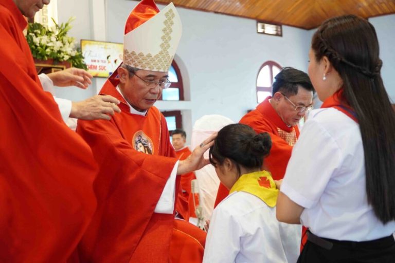 Sau đó, Đức cha Louis đã long trọng xức dầu ban Bí tích Thêm Sức cho các em. Lần lượt các em thiếu nhi đã tiến lên trước Đức giám mục để lãnh nhận ấn tín thiêng liêng của Chúa Thánh Thần.