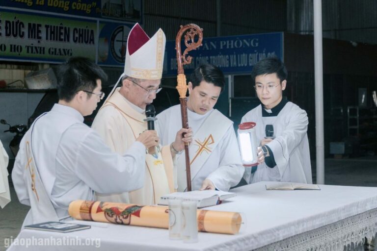 Trước thánh lễ, quý cha và cộng đoàn đã quy tụ về trước Linh đài Đức Mẹ, sốt sắng tham dự nghi thức cắt băng khánh thành và làm phép Linh đài trong niềm hân hoan và cảm tạ do Cha quản hạt Ngàn Phố – Giuse Trần Đức Ngợi chủ sự.