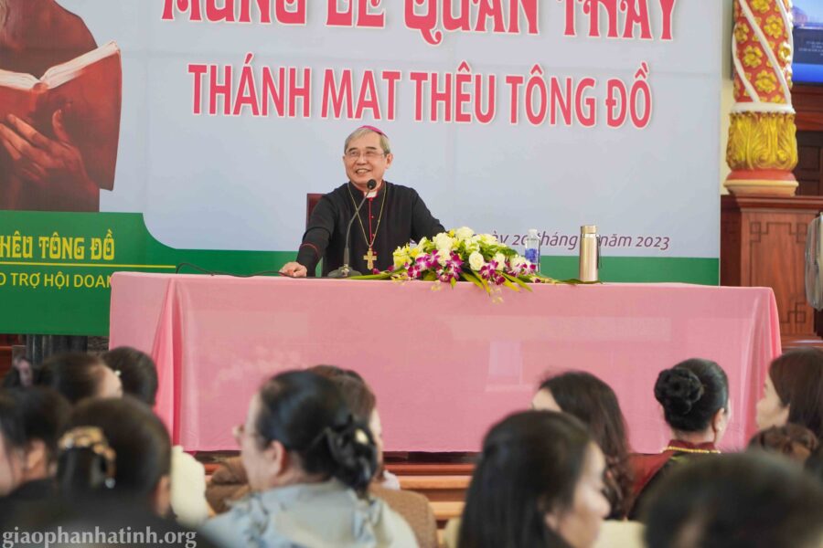 Ngỏ lời cùng anh chị em doanh nhân trong phần chia sẻ, Đức cha đã nói về bức chân dung tinh thần của Thánh Matthêu, về cuộc đời, ơn gọi, sự đáp trả mau mắn, dứt khoát và những đặc sủng của Thánh nhân đón nhận được từ Thiên Chúa. Bàn thu thuế mà thánh Mát-thêu ngồi trước đây là tình trạng tội lỗi của ông nhưng ông đã dứt khoát với quá khứ, với tình trạng tội lỗi của mình để sống trong ân sủng và làm chứng cho Ngài. Món quà của Thiên Chúa dành cho mỗi người là hồng ân sự sống, hồng ân hiện hữu và đặc biệt là hồng ân cứu chuộc. Mỗi người cần ý thức thân phận mỏng manh hư hèn yêu đuối và lỗi tội của mình để mau mắn trở về với lòng Thương Xót của Thiên Chúa sống hy sinh phục vụ như gương thánh Quan thầy trong môi trường kinh doanh.