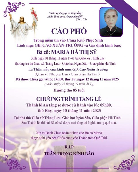 Trang chủ Cáo phó Hiệp thông Cáo phó: Bà Cố Maria – Thân mẫu của Linh mục GB. Cao Xuân Trường (Quản xứ Nhượng Bạn) Nguồn: Giáo phận Hà Tĩnh
