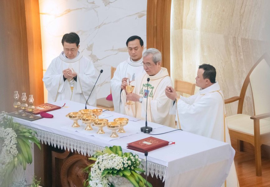 Ngay từ sớm, quý cha quy tụ nơi bàn tiệc Lời Chúa và bàn tiệc Thánh Thể, cùng hiệp dâng Thánh lễ kính Thánh Martinô – Giám mục thành Tours, do Đức cha Louis Nguyễn Anh Tuấn – Giám mục Giáo phận Hà Tĩnh chủ tế.
