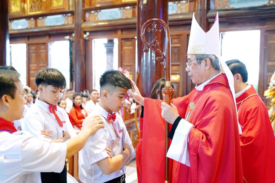 GPHT (10.11.2025) – Bí tích Thêm Sức là dấu ấn trọn vẹn của ân sủng Bí tích Rửa Tội, giúp người tín hữu được kiện toàn trong đức tin, thêm can đảm để sống và làm chứng cho Chúa Kitô, đồng thời gắn bó mật thiết hơn với Thiên Chúa và Hội Thánh. Ý thức được tầm quan trọng ấy, Đức cha Louis Nguyễn Anh Tuấn – vị mục tử đầy thao thức với đoàn chiên đã luôn ưu tư ban phát ơn Thánh Thần cho các tâm hồn trẻ trong Giáo phận. Chiều Chúa Nhật, ngày 09/11/2025, Đức cha Louis đã về với Giáo xứ Văn Phú để cử hành Thánh lễ ban Bí tích Thêm Sức cho 54 em thiếu nhi.