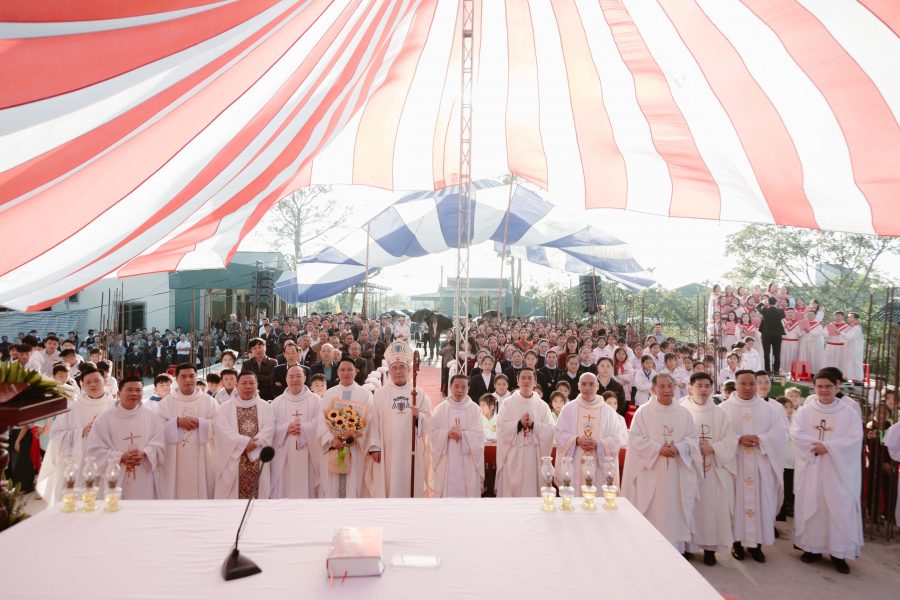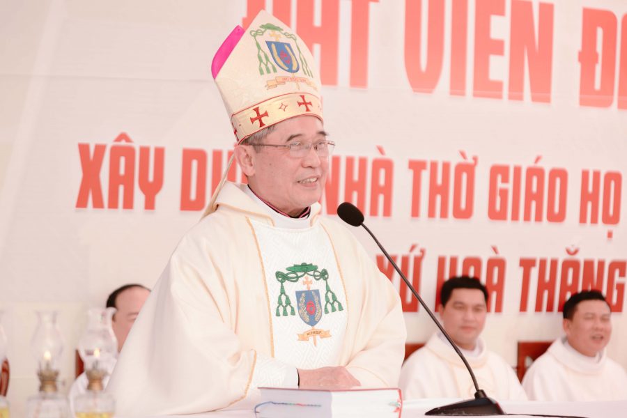 Lúc 15 giờ 00, Đức Cha Louis Nguyễn Anh Tuấn – Chủ chăn Giáo phận đã long trọng chủ sự Thánh lễ tạ ơn và làm phép viên đá góc xây dựng nhà thờ Hòa Bình. Thánh lễ có sự hiện diện đông đảo của quý cha, quý chủng sinh, tu sĩ, quý khách mời và cộng đoàn Giáo xứ Hòa Thắng.