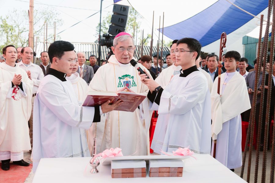 Nghi thức làm phép và đặt viên đá góc diễn ra trong bầu khí trang nghiêm. Tiếng kinh nguyện vang lên giữa không gian còn in dấu vết của đổ nát, như lời tuyên xưng mạnh mẽ rằng: từ tro tàn thử thách, một ngôi nhà đức tin mới đang được khai sinh.